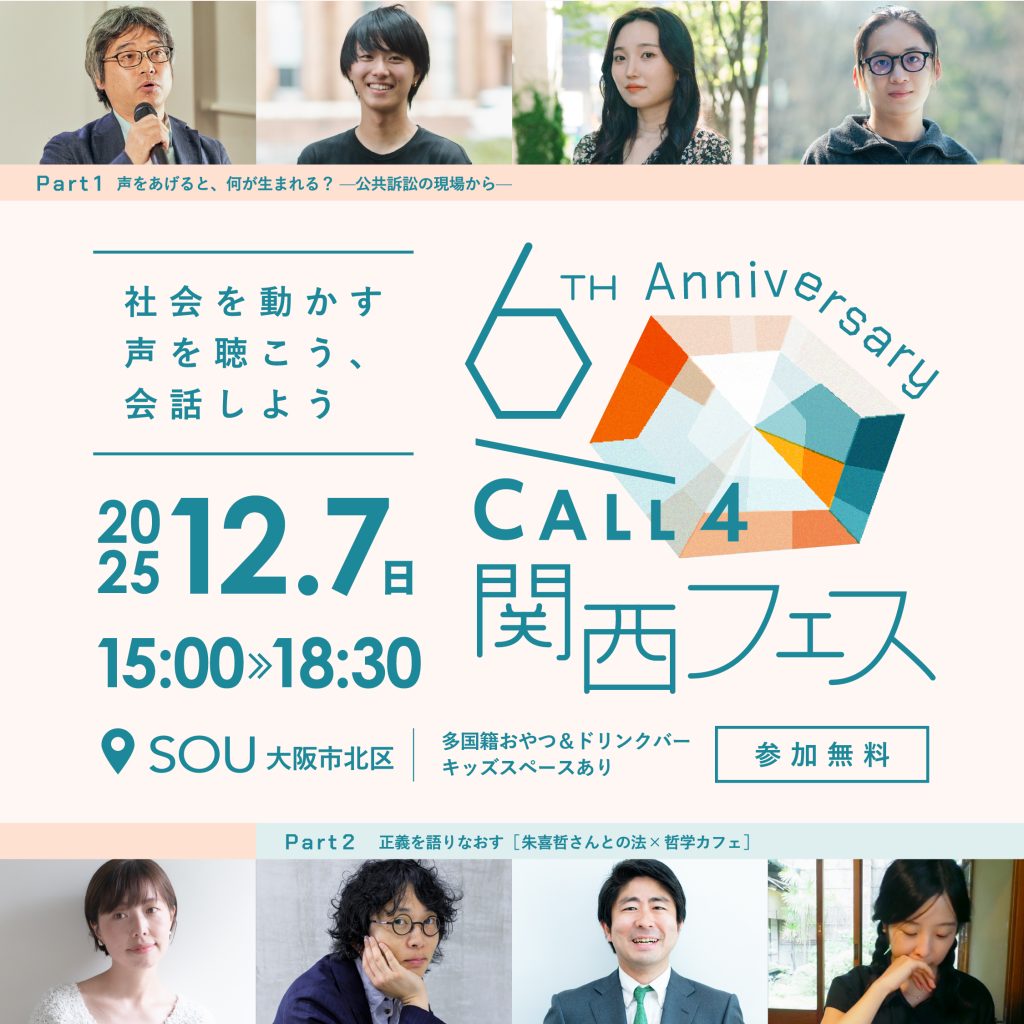 社会課題の解決をめざす“公共訴訟”のウェブプラットフォームCALL4は、この秋、6周年を迎えました。日頃の感謝を込めて、9月の東京に続いて大阪でも『CALL4関西フェス』を開催します。