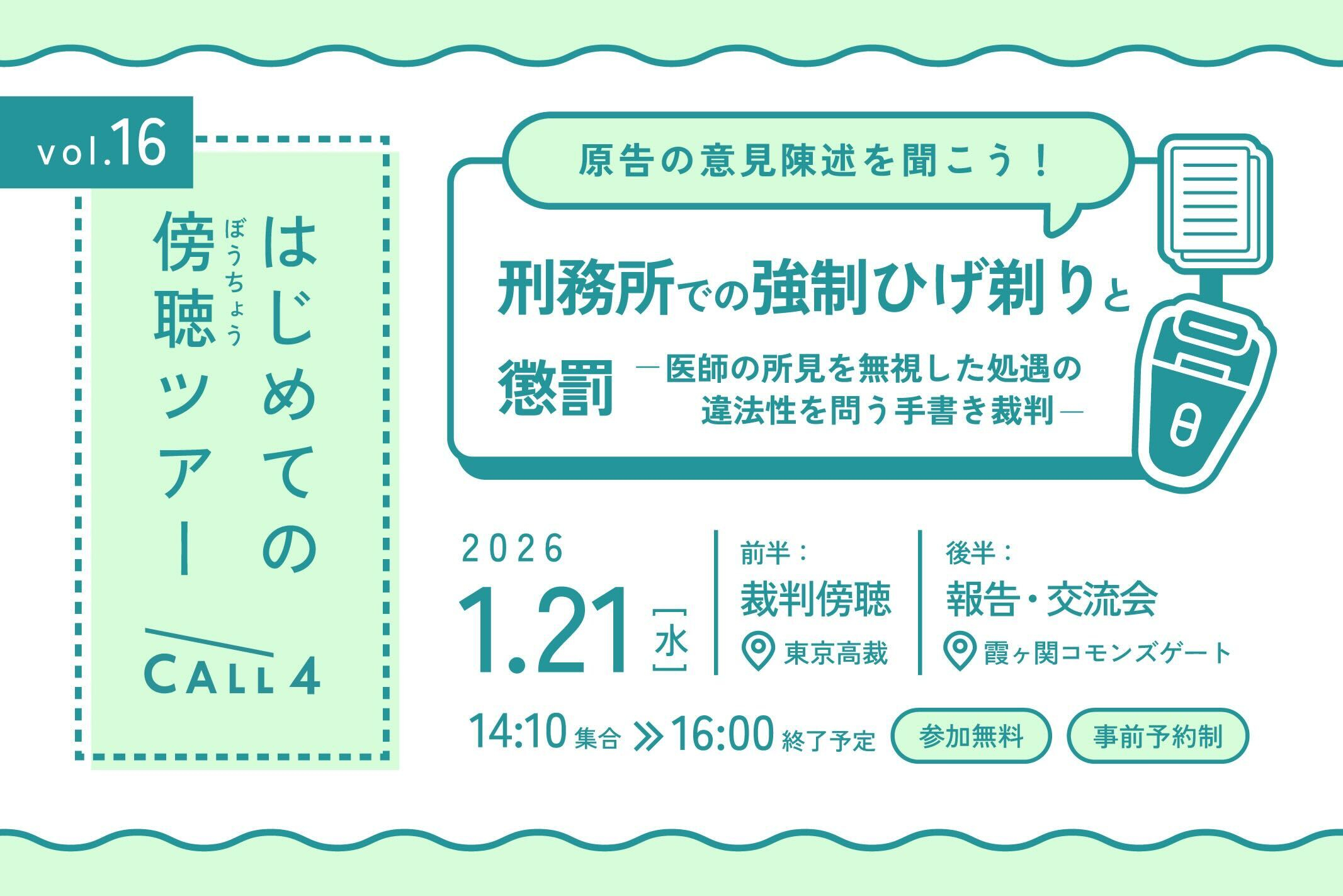 - 2025.12.15 はじめての裁判傍聴ツアーVol.16 【「刑務所での強制ひげ剃りと懲罰 ~医師の所見を無視した処遇の違法性を問う手書き裁判~」 — 原告の意見陳述を傍聴しよう!】開催のお知らせ First-Time Court Observation Tour Vol. 16 ["Forced Shaving and Punishment in Prisons - A Handwritten Trial Questioning the