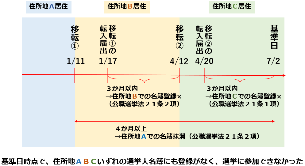 私は、2025年1月に東京都A区から東京都B区に引越し、同年4月に東京都B区から京都府C市に引越しました。これらの転居により、第27回参議院議員選挙の基準日時点で、いずれの住所地の選挙人名簿にも登録されず、同年7月20日に行われた同選挙で投票することができませんでした。