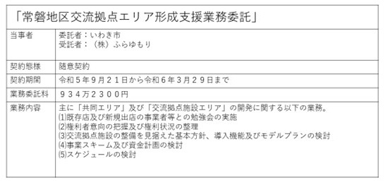In the Yumoto-machi redevelopment project in Iwaki City, local civil engineering, construction, and innkeeping businesses, whose executives also serve on a voluntary organization that had previously entered into a partnership agreement with Iwaki City, established "Furayumori Co., Ltd." under government leadership. Shortly thereafter, without any prior business experience, they received a public works contract from Iwaki City. Then, "Furayumori" immediately subcontracted the work to a consulting firm in Kanagawa Prefecture that has long had ties with Iwaki City, a situation that inevitably raises suspicions of profiting from specific relationships.