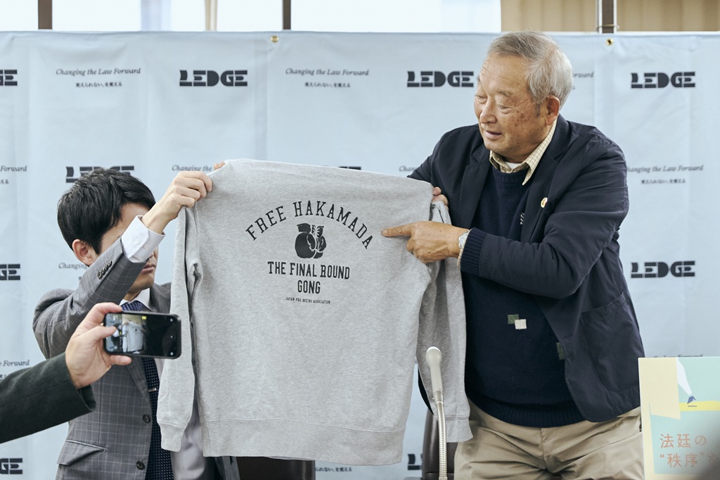 それから10か月後、静岡では袴田事件の審理が行われていた。しばらくつつがなく審理が進んだのち、弁護団の一人は休憩時間に裁判長から「ちょっと来て、見せて」と呼ばれ、胸元の支援団体バッジ(直径2センチ、文字サイズ2ミリ)を外すよう求められた。裁判長の目に入らなかったこのバッジを、同じく支援者の清水一人さんも普段から着けていたが、清水さんも外すよう求められたうえ、入廷時には背中に「Free Hakamada」と書かれたパーカーの「Hakamada」部分のみガムテープで覆われた。